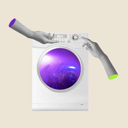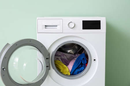 Modern washing machine with laundry near color wall