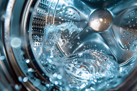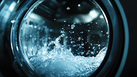 A captivating close-up of splashing water inside a washing machine drum, showcasing dynamic motion and refreshing bubbles. Ideal for home appliance themes.