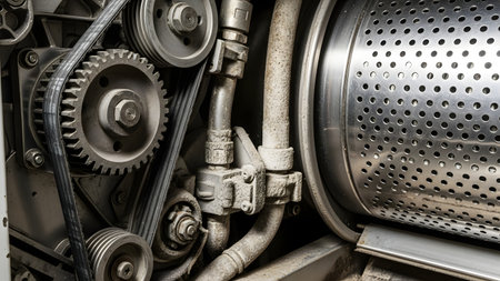A close-up view of the internal mechanism of a machine, likely a washing machine, showing the motor, rubber belt, and metal pulleys. The industrial texture, dust, and gears highlight engineering and maintenance concepts.