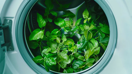 Washing machine with green leaves inside, close-up. Eco-friendly concept.