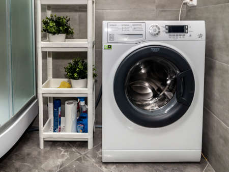Petrozavodsk, Russia - 29 August 2020. washing machine Hotpoint Ariston in the bathroom
