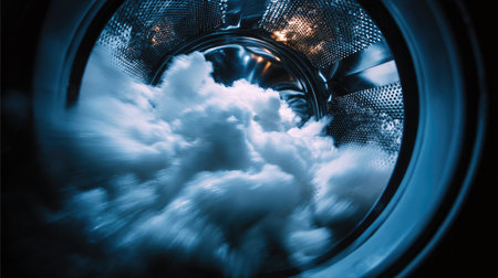 Experience the dynamic visual of a washing machine drum filled with white fabric, generating bubbles and foam during the wash cycle. A representation of domestic cleanliness.