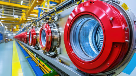 A row of washing machines in a factory with red and blue lights, AI