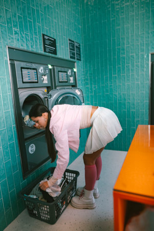 A young woman is engaged in the process of doing laundry at a modern laundromat facility