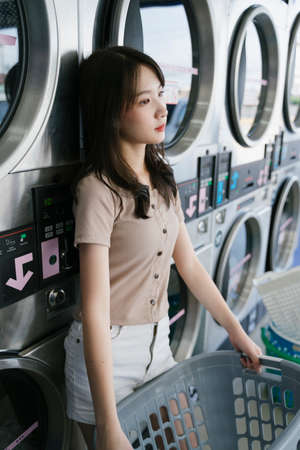 Cute girl standing in front of washing machine in luandromat and hold the gray basket.