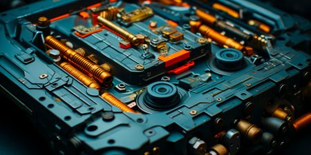 Close-up of intricate metal machinery components with detailed texture.