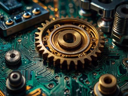 This image features an intricate arrangement of gears and circuit patterns, showcasing a blend of technology and engineering elements in warm tones.