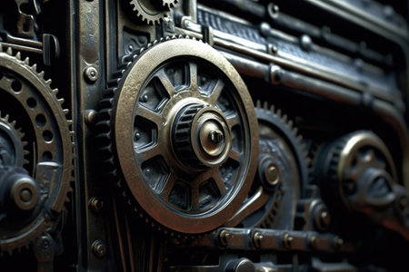 Interlocked machinery turning steel wheel in old factory generated by artificial intelligence