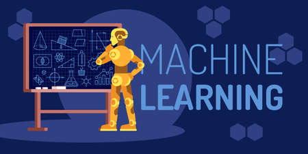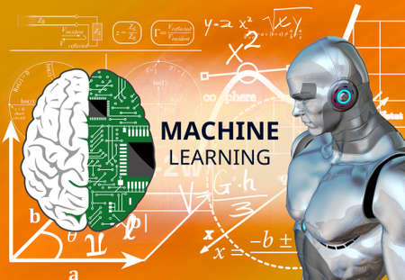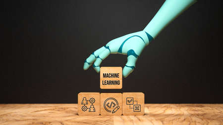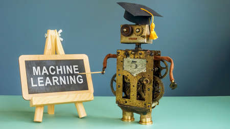 Data technology and machine learning concept. Robot head and mechanic arm holding letters to form the machine learning wording.