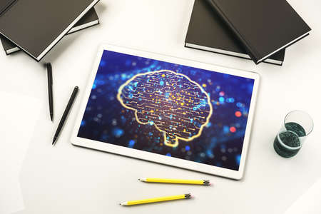 Creative artificial Intelligence concept with human brain sketch on modern digital tablet display. Top view. 3D Rendering