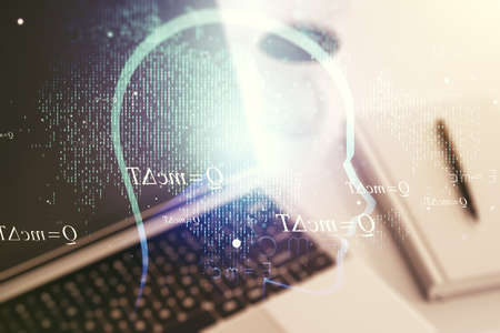 Creative artificial Intelligence concept with human head sketch on modern computer background. Double exposure