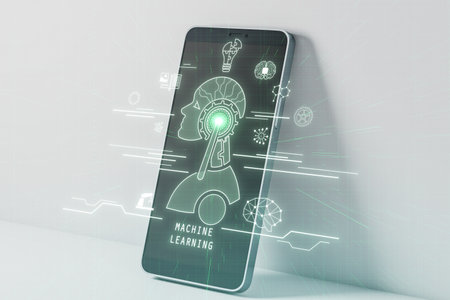 Close up of mobile phone with glowing robot head and icons on blurry background. machine learning and AI concept. 3D Rendering