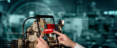 Engineer use augmented reality software in smart factory production line with automated application . Futuristic machinery in working in concept of Industry 4.0 or 4th industrial revolution.