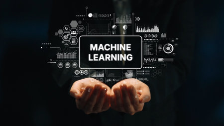 Hands Holding Machine Learning Concept with Graphs, Data, and Elements Representing Technology and Innovation. Asymptotic smart data analytic.