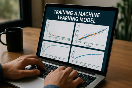 Software engineer training a machine learning model using a laptop, analyzing charts and graphs on the screen