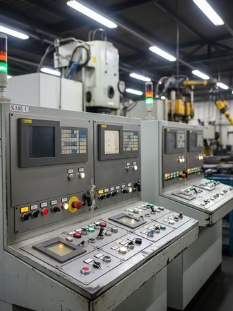 A close-up of a control panel in a manufacturing facility, showcasing vibrant colors and various buttons, highlighting modern industrial technology and processes.