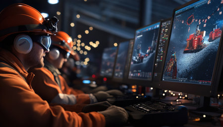 An operator's hands are seen manipulating a control panel in front of a series of digital displays. The scene features cool tones and ambient lighting, creating a modern, technical setting. The composition could be useful in illustrating themes of technology, data analysis, or industry.