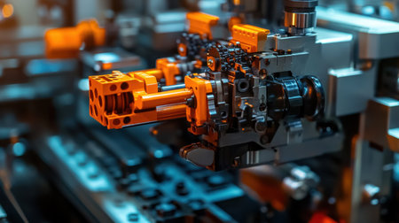 Close-up view of precision engineering machinery showcasing a metallic component. Ideal for illustrating advanced technology and manufacturing processes.