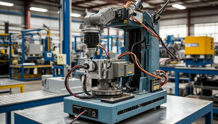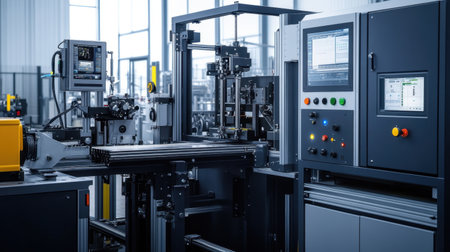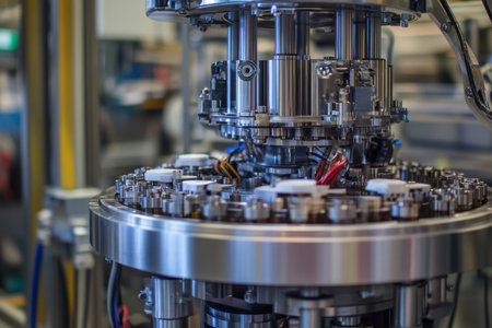 Close-up view of a sophisticated industrial machinery component highlighting intricate details and precision engineering in a modern manufacturing environment.