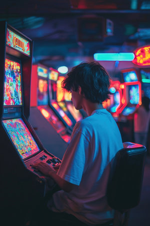 Gamer concentrating while playing arcade game in amusement park, illuminated by colorful neon lights