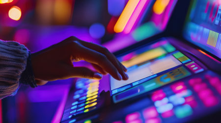 Gambler playing slot machine in casino touching screen with colorful neon lights