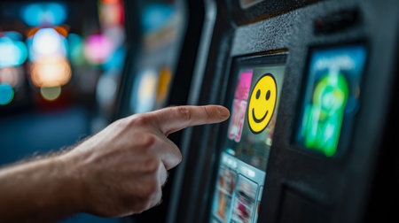 A person interacts with a vibrant digital interface, tapping a cheerful emoticon on a sleek touchscreen amid cityscape ambiance.
