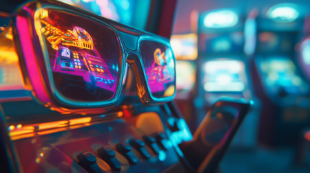Vintage arcade machines reflected in stylish sunglasses during a vibrant gaming night