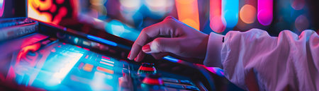 Close-up of hands playing slot machines in a casino with neon lights and a blurred background depicting a lively gaming scene