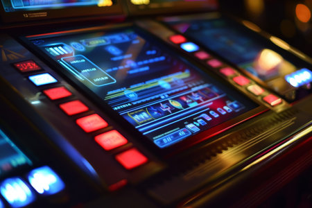 Vibrant close-up of a video poker gaming screen with glowing digital displays and controls, set against a blurred casino background
