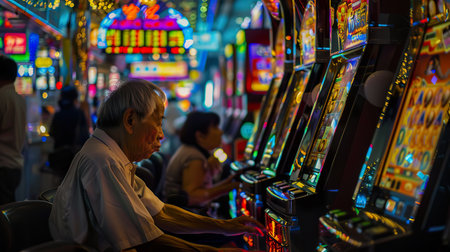 Asian Man Focused on Slot Machine at a Vibrant Casino. Concept of Gambling, Nightlife Excitement, Gambling addiction, and Casino Atmosphere.