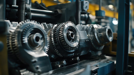 A detailed close-up of industrial gears in action, highlighting the intricate engineering and precision involved in manufacturing processes within a factory environment.
