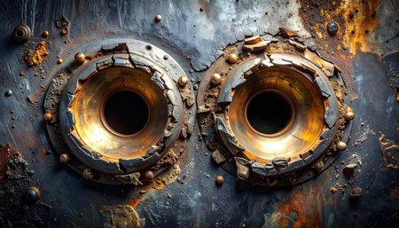 Two circular openings with golden rims, showing rust and debris on a dark textured surface.
