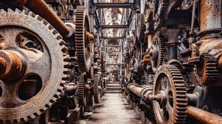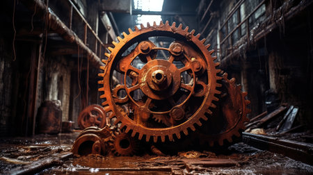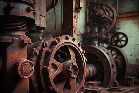 close-up of rusty gears and cogs in abandoned factory, created with generative ai
