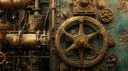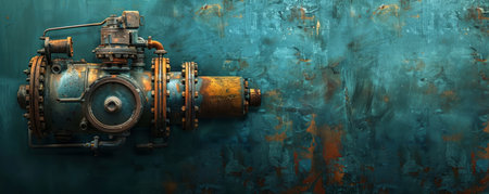 High Resolution Industrial Machine Part Image Rusted Metal Engine Component with Turquoise and Rusty Patina Background, Steampunk Aesthetic for Engineering and Technology Inspired Designs AI Generative