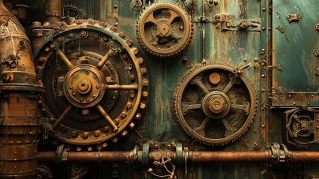Old machinery reveals intricate gears and weathered metal in a forgotten workshop bathed in soft light