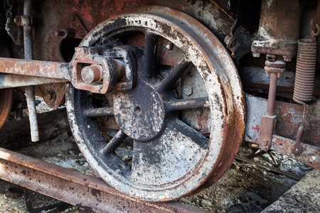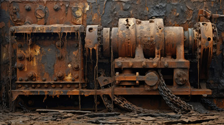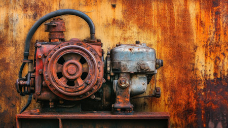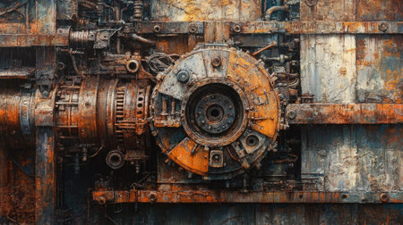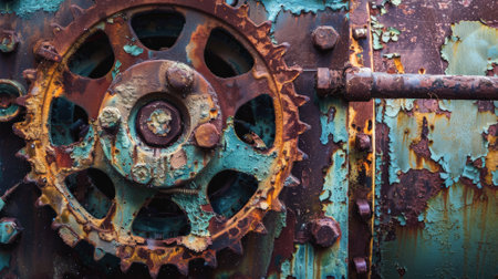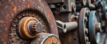 This close-up image highlights the intricate details of a rusty industrial machine, showcasing the rich textures and worn components that tell a story of age and use.