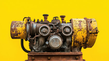 A vintage industrial engine featuring a striking yellow background showcases its mechanical details and rusty finish, evoking nostalgia for retro machinery.