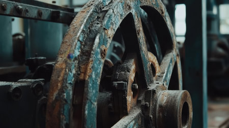 close-up of rusted gears and cogs in abandoned factory, created with generative ai