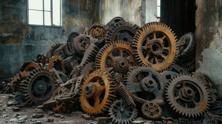 A striking image featuring a large pile of rusty gears and cogs in an abandoned industrial setting. The grungy backdrop enhances the sense of decay and history.