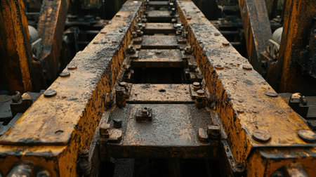 A large, rusty, and dirty yellow machine with many bolts and nuts. The machine appears to be a piece of heavy equipment, possibly a bulldozer or a crane. Scene is one of wear and tear