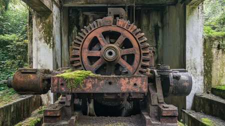A close-up view of a vintage industrial gear surrounded by nature, highlighting the contrast between man-made machinery and lush greenery in an abandoned setting.