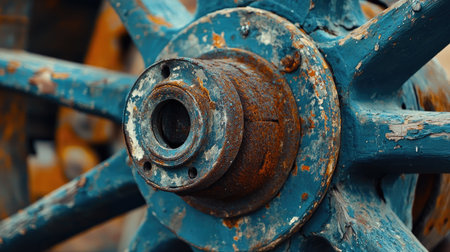 Close up of a rusty gear with peeling paint, evoking a sense of decay and abandonment