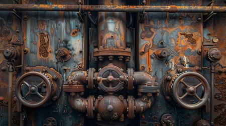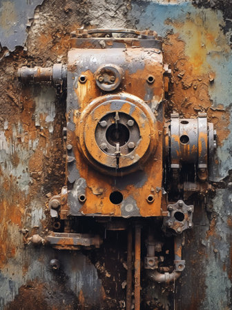This image captures a close-up view of a vintage industrial machine control panel, showcasing intricate details and a weathered, rusty finish that reflects the passage of time.