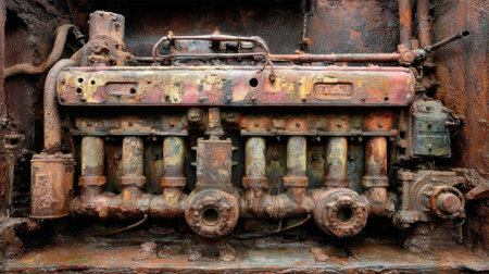 This image features a rusty industrial engine mounted on a weathered metal surface. The vibrant colors and detailed textures showcase the beauty of vintage machinery.
