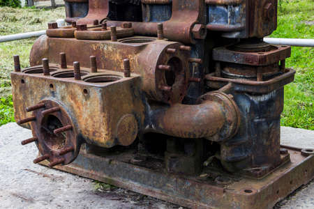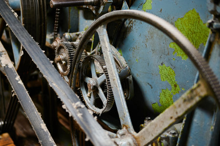 Close-up of vintage industrial machine with rusted components and complex mechanical parts