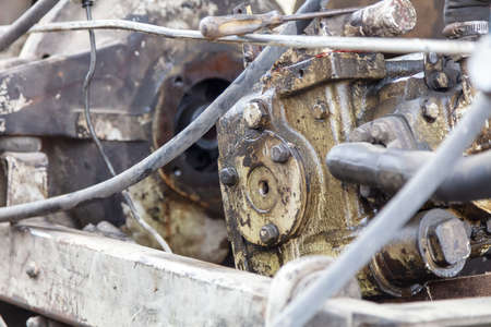 vintage retro tractor rusty details close up. gearbox, levers, viring and mechanical arms with rust and paint leftovers in sunny day