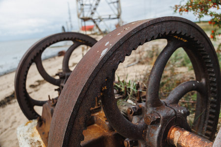 Closeup of rusted gears by the sea, showcasing industrial decay and natures reclaiming of the landscape