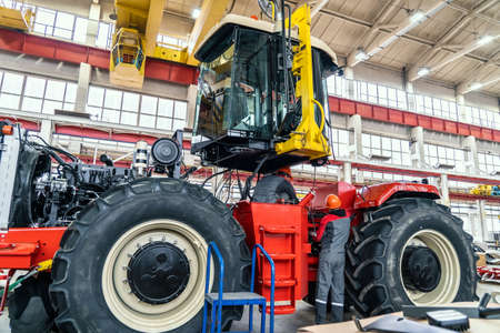 Process of assembling industrial agricultural machine in factory. Harvester or tractor production line.