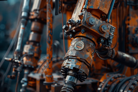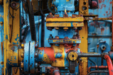 Intricate machinery features vibrant and weathered pipes and valves, highlighting the rich textures and colors of industrial equipment in a working environment.