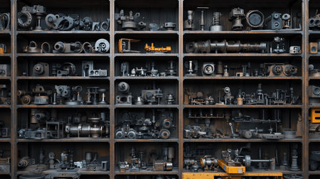 A comprehensive arrangement of various industrial machine parts and tools meticulously organized on shelves, perfect for manufacturing and engineering contexts.